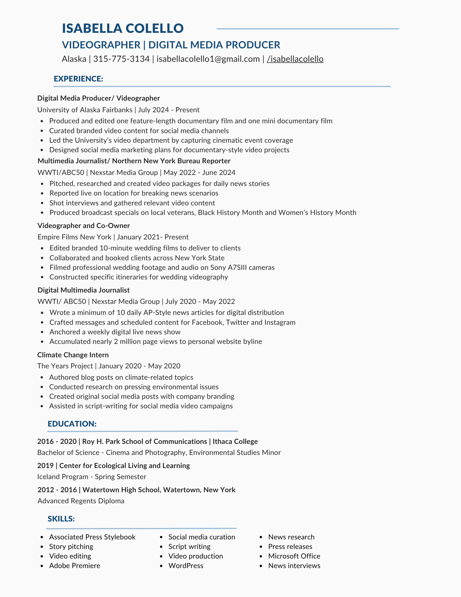 She formerly worked as a Multimedia Journalist for four years at the ABC-affiliates WWTI/ABC50 and WSYR/NewsChannel 9 in Upstate, New York.
